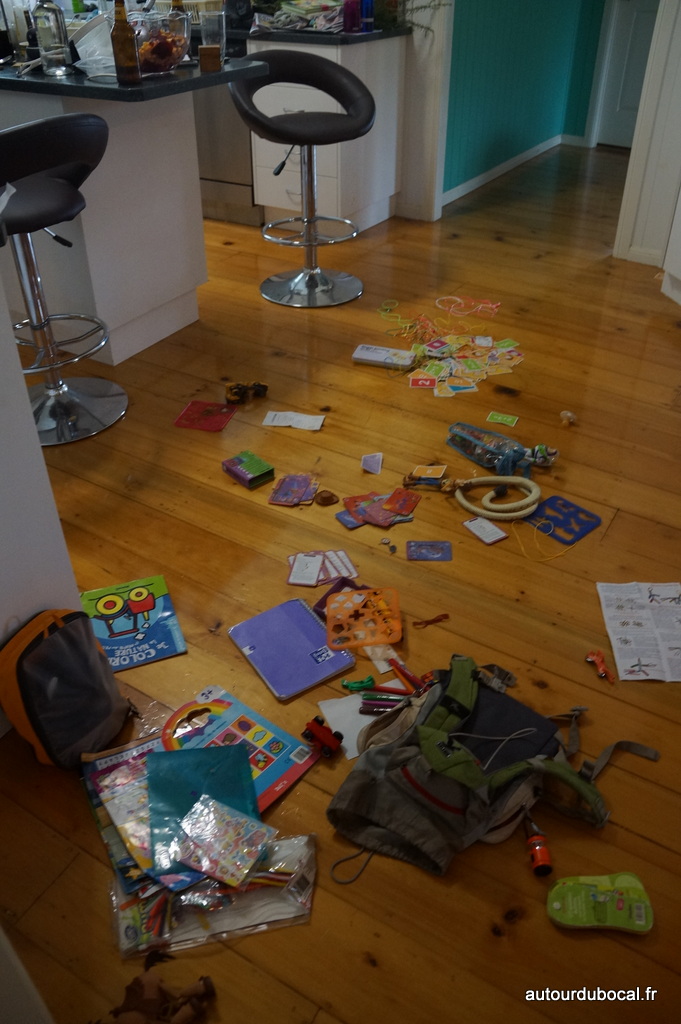 Théandre n'a qu'un seul sac à dos de jouets et pourtant ils arrivent quand même à mettre le bazar